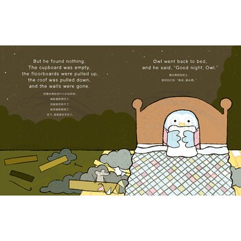 猫头鹰准备睡觉了,他对自己说:“晚安,猫头鹰(good night,owl)!”但每次他刚刚闭上眼睛,就听到房间里奇怪的叫声:squeek!猫头鹰睁开眼睛,在房间里找那个声音的来源。猫头鹰把橱柜、书架、地板统统都翻了个遍,他能找出那个奇怪的声音,然后安心睡觉吗?……猫头鹰将永远不会睡觉,除非他能搞清楚这是怎么回事!也许,一句温柔的由此及彼的“晚安”是让大家都能享受安稳夜晚的魔法……