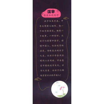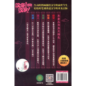 汉字是世界上古老的文字之一,也是优美的文字之一。每一个汉字都是一个传奇,小朋友可以在妙趣横生的故事和知识乐园中了解它们的前世今生,走进它们的英雄事迹,体味汉字,学习汉字。《汉字!汉字!汉字原来如此:有画面的字》包含75个象形字,很有画面感,从它们的源流讲起,并且连带着讲了与之相关的历史典故、科学知识、地理知识等,对于儿童成长很有助益。