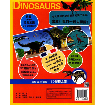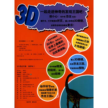 《3D发现之旅·3D恐龙王国:侏罗纪1》介绍恐龙是生活距今2亿3500万年至6500万年前的,能以后肢支撑身体直立行走的一类动物,支配全球陆地生态系统超过1亿6千万年之久。大部分恐龙已经灭绝。古生物学家们通过对恐龙化石的研究,推测恐龙的形态及习性。根据他们的研究,恐龙就像现生的动物一样,以图片的形式,详尽的展现在读者面前。以时间主线,为使读者展现恐龙的分类、习性及电脑还原的图片。