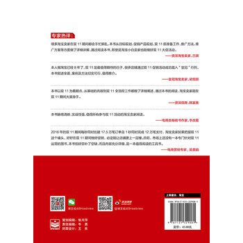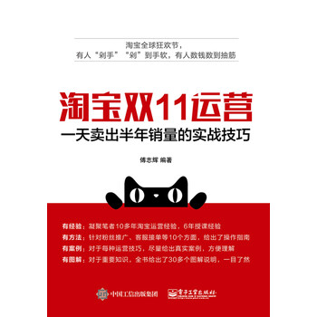 《淘宝双*1运营:一天卖出半年销量的实战技巧》主要研究的是淘宝双1*运营的各个方面,希望能在双*1之前给淘宝运营者和电商一些启发,帮助他们更好的备战双*1。《淘宝双*1运营:一天卖出半年销量的实战技巧》通过对双*1之前的预热以及目标制定、双1*之时的运营和双*1之后的售后三个方面的详解,每个方面都进行了全面的分析,并针对不同类型的淘宝店铺提供了具体的可以实施的备战双*1方案。里面的内容涉及到淘宝店铺双*1之前的预热推广、店铺装修以及各种应急措施等,全面的同时不失详细。本书所涉及内容虽然以双*1为案例,但读者也可以举一反三地应用于618、双*2等重大促销活动。
