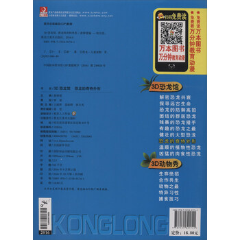 远古恐龙都是巨大的体型,但是在它们中间,还有更加巨大的,高高的身体,长长的尾巴和脖子,通常,这些高大的恐龙都是一些植食性恐龙,它们高大的身躯更利于采食到高处的食物,也更利于让肉食恐龙产生畏惧,总之,它们的庞大不是它们的负担,而是它们的优势。让孩子切身感受那个与众不同的世界的魅力。《3D恐龙馆:恐龙的奇特外形》采用大图少字的形式,内文中都是跨页图,而且带有3D立体效果,只要孩子戴上眼镜,就会发现书中的恐龙赫然活跃在纸上,真是无比神奇的一本恐龙书。