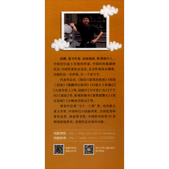 杨鹏,中国首位迪士尼签约作家,中国社科院文学所副研究员,中国作家协会会员,中国儿童文学研究会副秘书长。出版作品100多部。主要作品有:儿童文学《装在口袋里的爸爸》《校园三剑客》《幻想大王奇遇记》等,动画片《少年狄仁杰》《千千问》《福娃》等,中国首部大型科幻话剧《带绿色回家》等,创作翻译影视同期书《新黑猫警长》《快乐星球》《变形金刚》等。曾获中宣部“五个一工程”奖、国家图书奖、中国图书奖、宋庆龄儿童文学奖、银河奖、全国优秀科普作品奖、金鹰奖、美猴奖等各类国家以上大奖30多次,多篇作品被翻译成英、日、韩等多国文字,在海外出版。