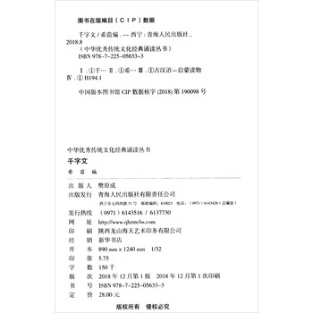 《千字文(青少彩图版)》是南朝梁武帝时期(502—549年),员外散骑侍郎周兴嗣奉皇命从王羲之书法中选取1000个字,编纂成文的。文中1000字本来不得有所重复,但周兴嗣在编纂文章时,却重复了一个“洁”字(洁、絜为同义异体字)。因此,《千字文》实际只运用了999字。