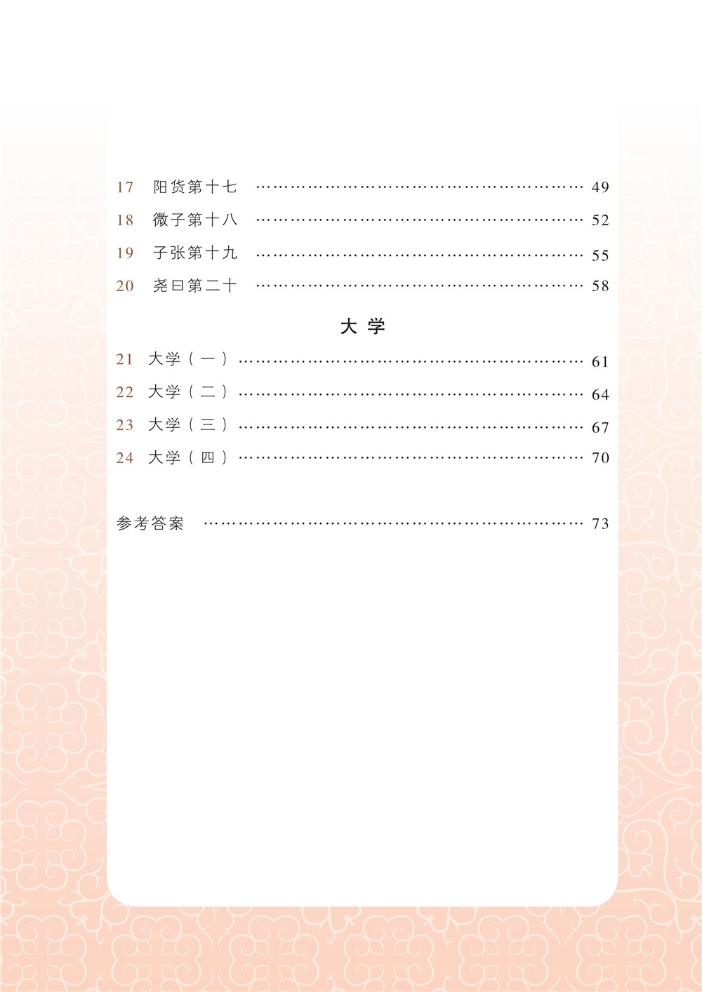 优秀传统文化是我们国家与民族文化自信的重要源头,在义务教育阶段开展经典启蒙课程的学习,作为语文教育的一种有益补充,将会使广大青少年更好地亲近中华经典,更加广泛深入地领悟中华思想理念、传承中华传统美德、弘扬中华人文精神。本丛书由全国著名教育学者、一线名师领衔主编,根据古典典籍的难易程度与孩子们的学习认知规律分级选目,尽量保证古文选择的整体性,不割裂呈现,每课都设置有导读、原文、注释、知与行、广见闻等栏目,并配有名师诵读、打卡背诵等学习辅助资源,让小读者们真正能够入脑入心、学有所得。
