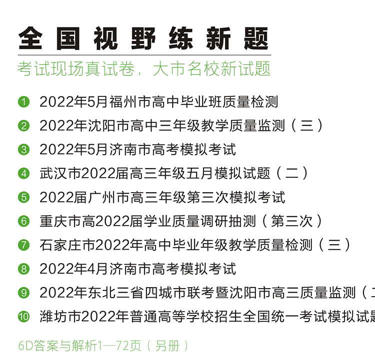 本书所选试卷多为2022高考前一个月内大型模拟统考试卷,因为考试较晚,目前市面上已有的2023年高考模拟汇编类产品未曾来得及收录,具有独特性;试卷本身都是大型考前模拟卷,命制规范、价值高,是很好的练手材料。