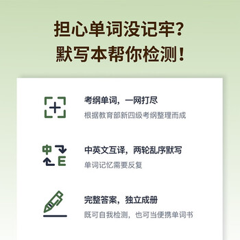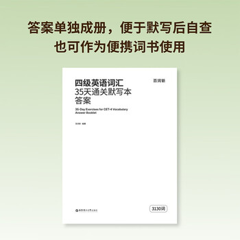 百词斩出品的《四级英语词汇35天通关默写本》收录四级考纲词汇,记练结合,严格参考考生的复习周期定制本单词计划,帮助巩固和检测词汇记忆。可搭配《百词斩四级词汇》使用。选题特点 ● 选词逻辑完整收录四级必考、常考和重难点词汇,适合全国各地的考生。 ● 每日计划 35天计划,根据备考周期,科学安排任务量。 ● 英汉互译每天两遍默写,正、乱序搭配,真实检测记忆效果。 ● 答案册单独成册,方便对照,小巧无负担。 ● App联动搭配百词斩App使用,线上同步学习不受限。