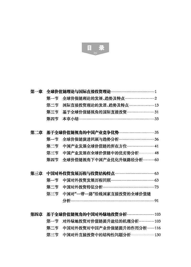 本书从全球价值链理论发展、趋势与特点以及与国际直接投资理论的交叉与融合关系出发,剖析基于全球价值链视角的对外直接投资问题,包括基于全球价值链视角的中国产业竞争优势、中国对外投资发展与投资结构特点、基于全球价值链视角的中国对外绿地投资、跨国并购与中国跨国公司全球价值链布局、中国对外投资结构优化的基本路径与方式、发达国家对外国投资限制及对中国对外投资的影响,以及中国对外直接投资结构优化的供给侧改革等问题展开了详细论述。并在此基础上,针对中国提升全球价值链中分工地位,采取多渠道并举、多维协同的投资方式,找准全球价值链高端环节的切入口,降低边际产业和富余产业转移的社会、政治等风险等问题提出一系列对策建议。
