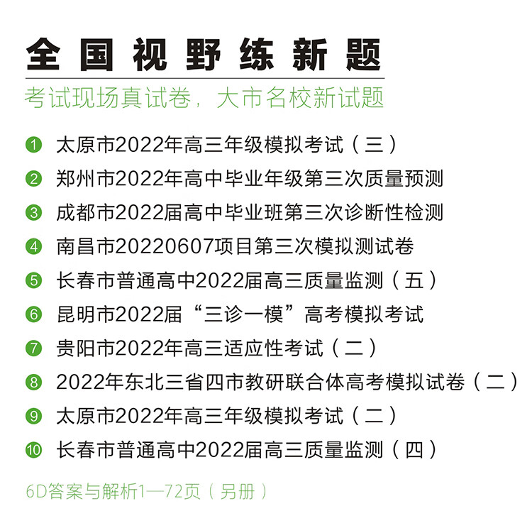 本书所选试卷多为2022高考前一个月内大型模拟统考试卷,因为考试较晚,目前市面上已有的2023年高考模拟汇编类产品未曾来得及收录,具有独特性;试卷本身都是大型考前模拟卷,命制规范、价值高,是很好的练手材料。