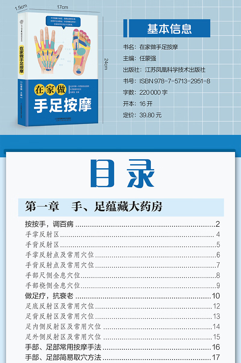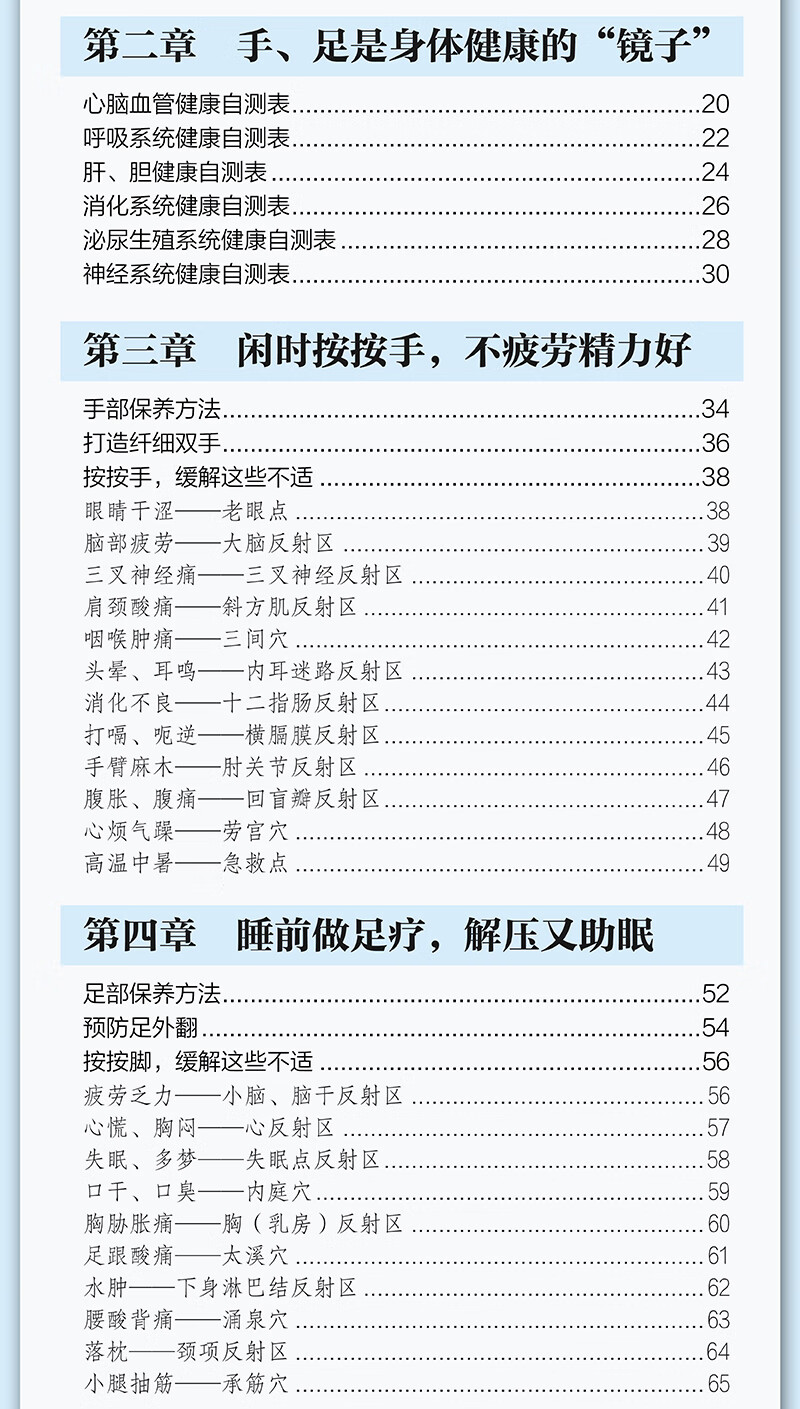 这本书不仅全面介绍了手部和足部的一些反射区和穴位点,配以高清大图,能够轻松取穴定位,还有六大系统健康自测表,通过手、足症状表现自测健康状况。另外,还介绍了常见不适的手足按摩方法,对症按摩效果更好。
