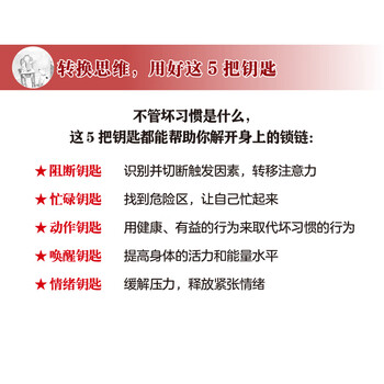 《坏习惯改不掉,怎么办》用钥匙解锁的形式,提供了帮助你摆脱坏习惯的5把钥匙:阻断钥匙、忙碌钥匙、动作钥匙 、唤醒钥匙、情绪钥匙。不管坏习惯是什么,这5把钥匙都能帮助你解开身上的锁链。