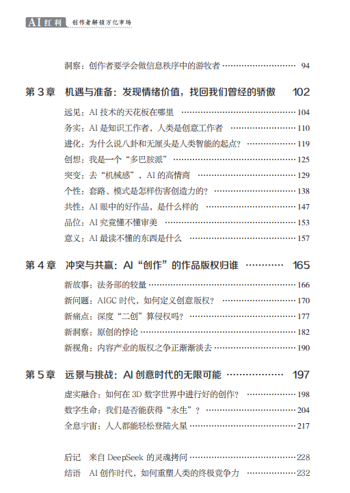 随着AI深入人类内容创作与社会生活的方方面面,我们不禁要问:AI正让我们失去什么?它是否存在能力上限?在与AI的合作中,如何找到科技与人文的平衡点?若AI的创造力比肩人类,传统的版权和知识产权规则是否还能有效保护人类创作者?本书将为您指明清晰的方向,助您把握AI红利时代的机遇与挑战。