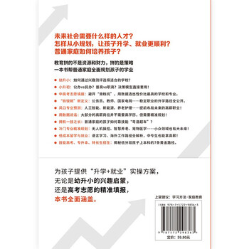 这本书没有空洞的理论,只有拿来即用的解决方案+升学报考指南+规划攻略。为孩子提供“升学+就业”实操方案,无论是幼升小的兴趣启蒙,还是高考志愿的精准填报,本书全面涵盖。你不需要从头读到尾,孩子处于哪个阶段,成绩如何,遇到了什么问题,成绩是好是坏,分数是高是低都能找到适合他的升学方案!让孩子拥有更好的前途!