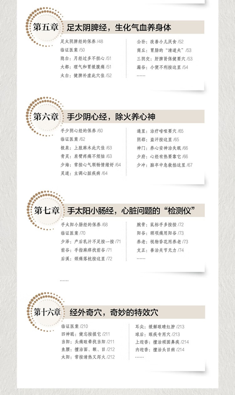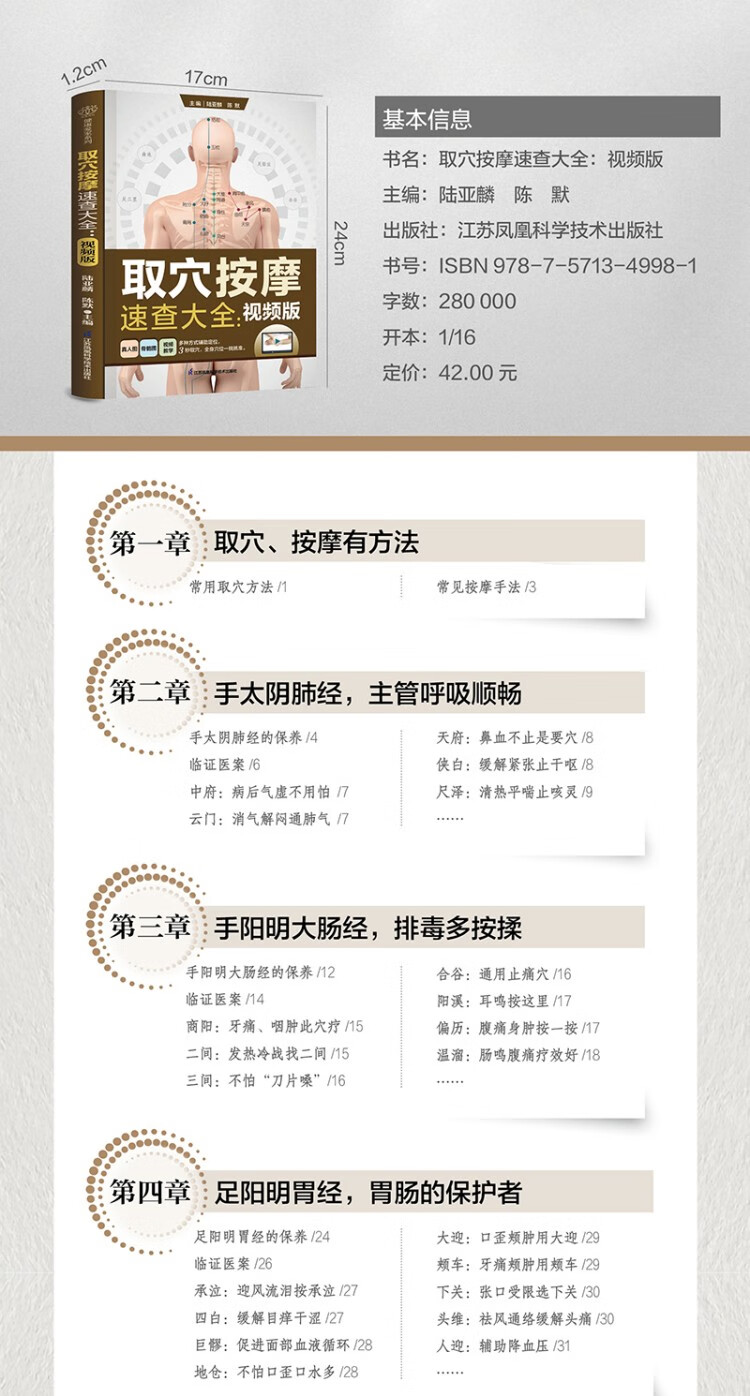 书中共收录了401个穴位,并附有真人图示和专家取穴按摩视频,每个穴位都有精准定位、三秒取穴、按摩手法和主治功效,易学易用。此外,书中还介绍了14条经络的保养宜忌和28个临床经典医案,零基础也能学得会,用得上。