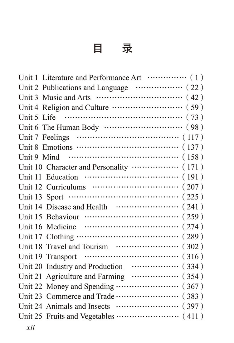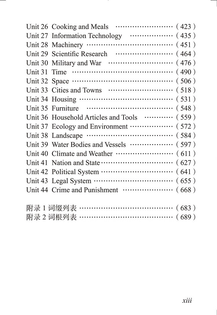 一、主题法。此部分罗列《大纲》词表在描述某一主题时可能会使用的全部词汇。例如,在法律词汇方面,《大纲》词表囊括了从违法、犯罪,到指控、审判,再到判刑、惩罚和释放等158个词项,而本书则将分散在《大纲》词表不同地方的这些词汇集中到一起,分成两个单元展示(Unit 43与Unit 44)。全书包含44个主题,每个单元一个主题。