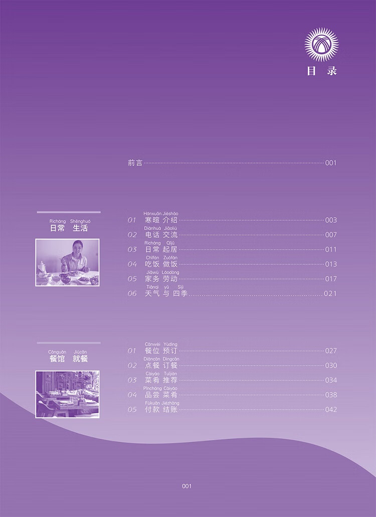 面向吉尔吉斯斯坦的国别化汉语教材,按日常生活、餐馆就餐、休闲娱乐、交通出行、购物消费、旅游出行、校园生活、职场打拼、恋爱婚姻、时尚话题分为十个场景主题,每个主题下又分为六七个次主题,每个次主题下安排两组对话。场景主题和次主题都是紧密结合日常生活、工作、学习设置,对话不仅注重汉语汉文化的教学,更结合吉尔吉斯斯坦本土的习俗及一些独特的风物,更容易为吉尔吉斯斯坦学习者接受。本书也可以作为吉尔吉斯语会话教材使用。