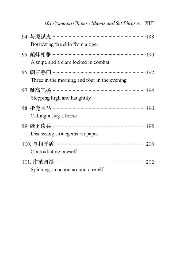 学习汉语的外国学生,当他们初步掌握了汉语的语音、词汇、语法和文字时,很想进一步提高自己的汉语水平。怎样提高呢?《成语101 》精选汉语中最有价值的、常用的、表现力强的成语、谚语、歇后语和典故各101则。每则均附英文释义,每则配一幅精美插图,另有一些难解词语中英文注释。