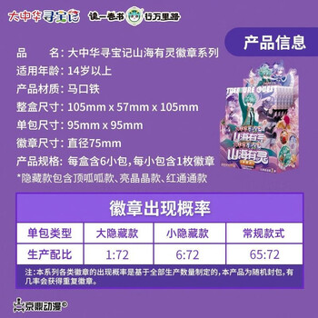 大中华寻宝记山海有灵徽章系列每盒含6小包,每个小包内含1枚徽章,款式随机。全系列共12款,包含9款常规款,2款小隐藏款,1款大隐藏款。