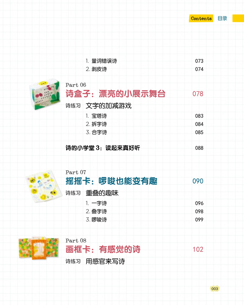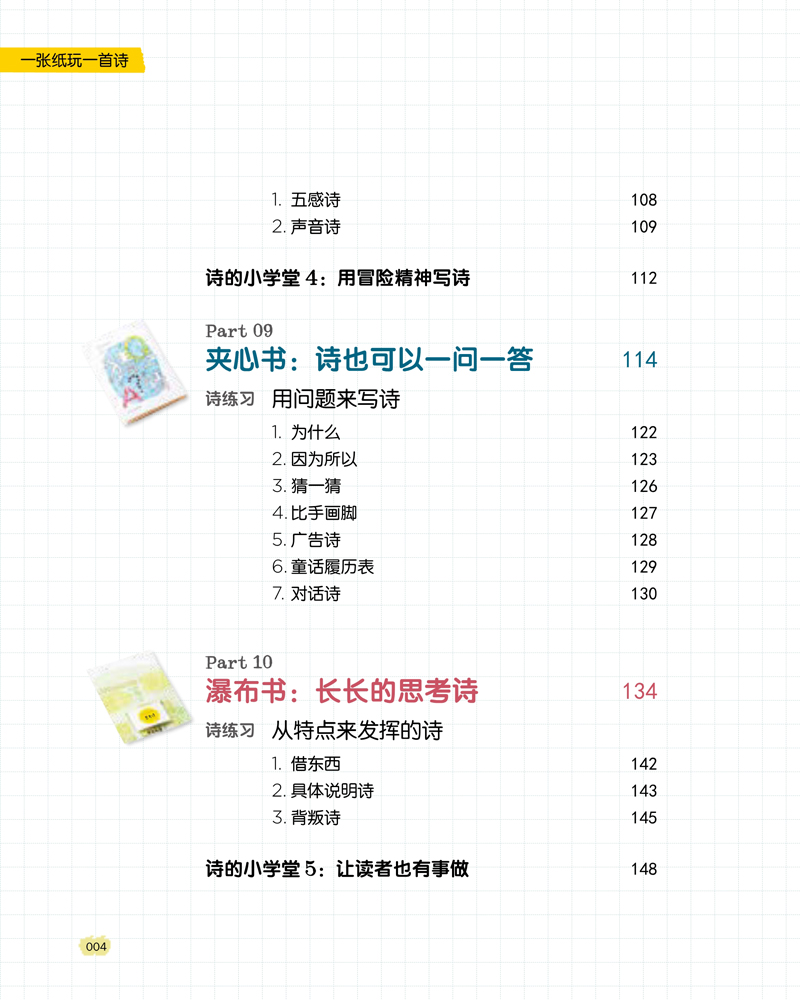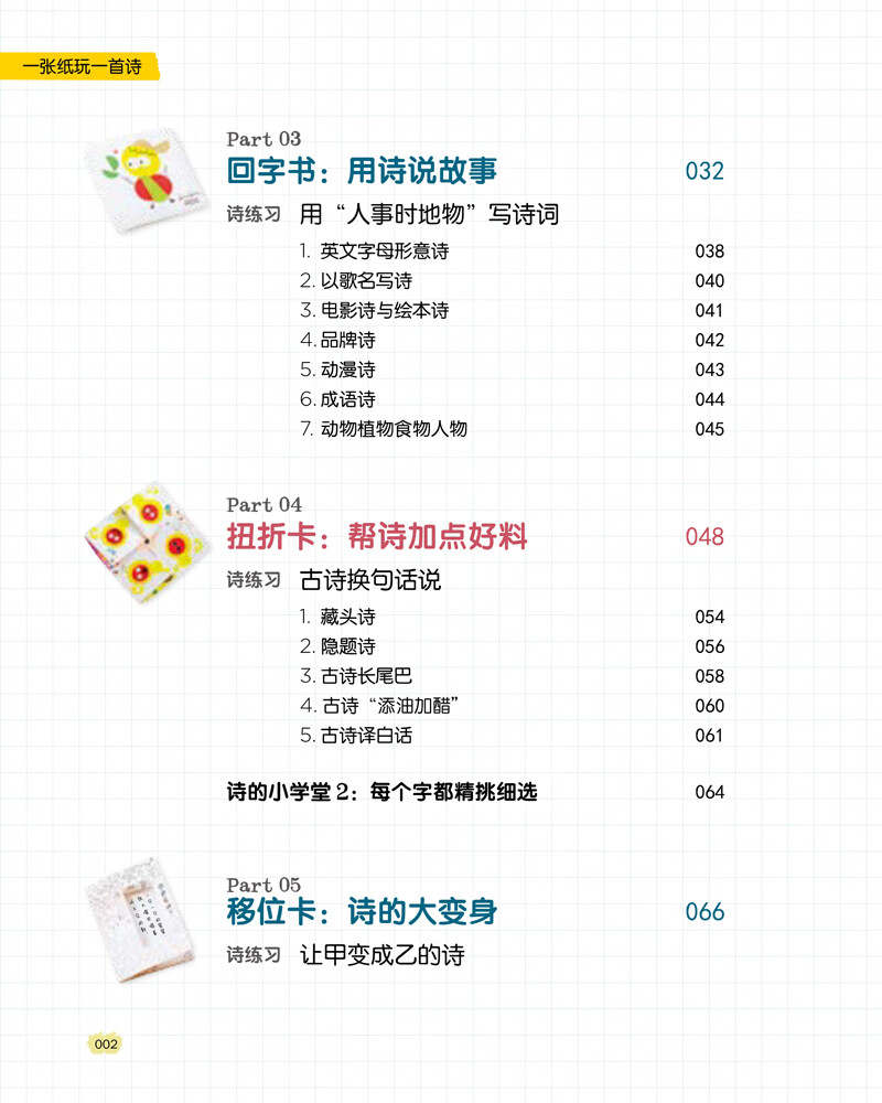 本书是诗和折纸的巧妙结合,培养孩子的核心素养——创意力。本书有“诗练习”和“诗的小学堂”等诗教学的栏目。诗不是古典格律诗,而是中国传统文化中的趣味诗——如“回文诗”“藏头诗”“宝塔诗”和创意女王王淑芬自创的创意诗——如“品牌诗”“电影诗”等,寓教于乐,教孩子如何写趣味诗,成为一名“小诗人”。本书还有丰富的折纸技巧,让孩子折出“包包书”“翻不完的书”……然后在书上每一页写上自创的诗,做成一本可以珍藏起来的小诗集,也可以当成“创意+个性化”的节日和生日礼物。手作手写,迸发无限创意。