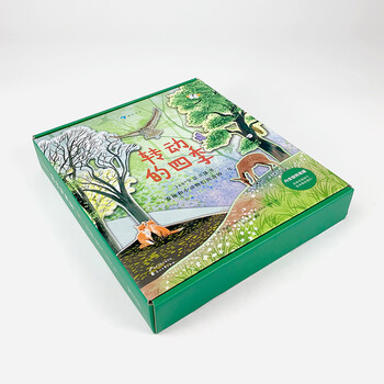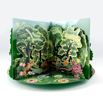 《转动的四季》分为春夏秋冬4个主场景,每个场景中都有多达4层的精致纸艺设计,打造真实森林的层叠效果。完全打开书后,瞬间呈现360°的全景立体画面。《转动的四季》附赠旋转底座,简单组装后即可变身精致摆件,轻轻转动书页,便能感受到森林中的四季流转、无限诗意。