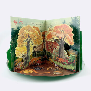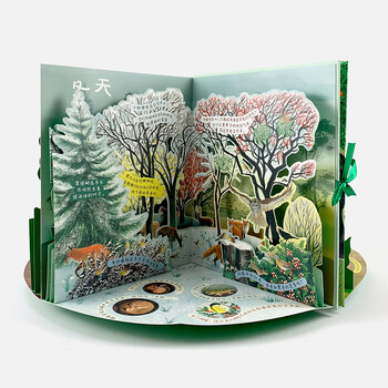 一本可旋转的360度全景立体书,呈现一座森林的春夏秋冬,和居住其中的小动物的奇妙生活。