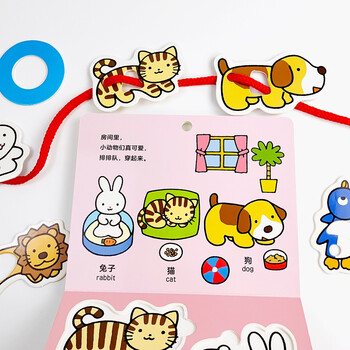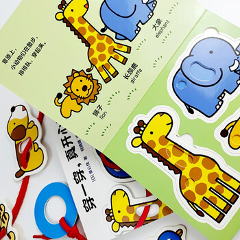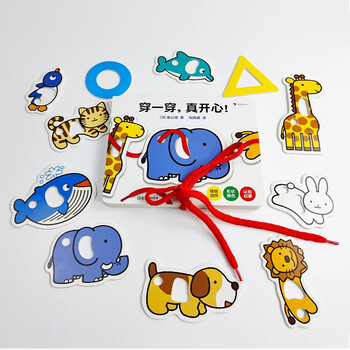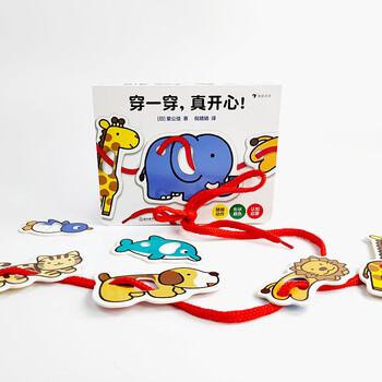《穿一穿,真开心!》是一本多功能益智启蒙玩具书。通过《穿一穿,真开心!》,小朋友可以认识形状、颜色和动物。书中的形状和动物名称都使用中英双语表示。而且,所有的形状和小动物卡片都可以取下来。在形状卡片上有一个大孔,在动物卡片上有一大、一小两个孔,书中还配有一根绳子,可以让小朋友将这些形状和动物穿起来,在游戏中锻炼手部的小肌肉发育。