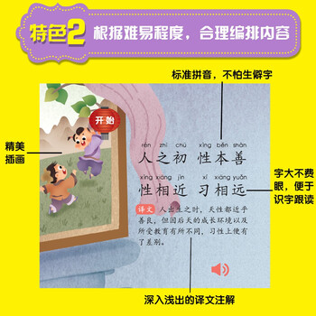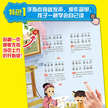 《会说话的点读发声书:三字经》通过手指点按发声,将《三字经》融入到优美的图画中,配有注音和译文,搭配亲切动听的声音,通过声音、图像和动手引导相结合,提高孩子阅读兴趣。